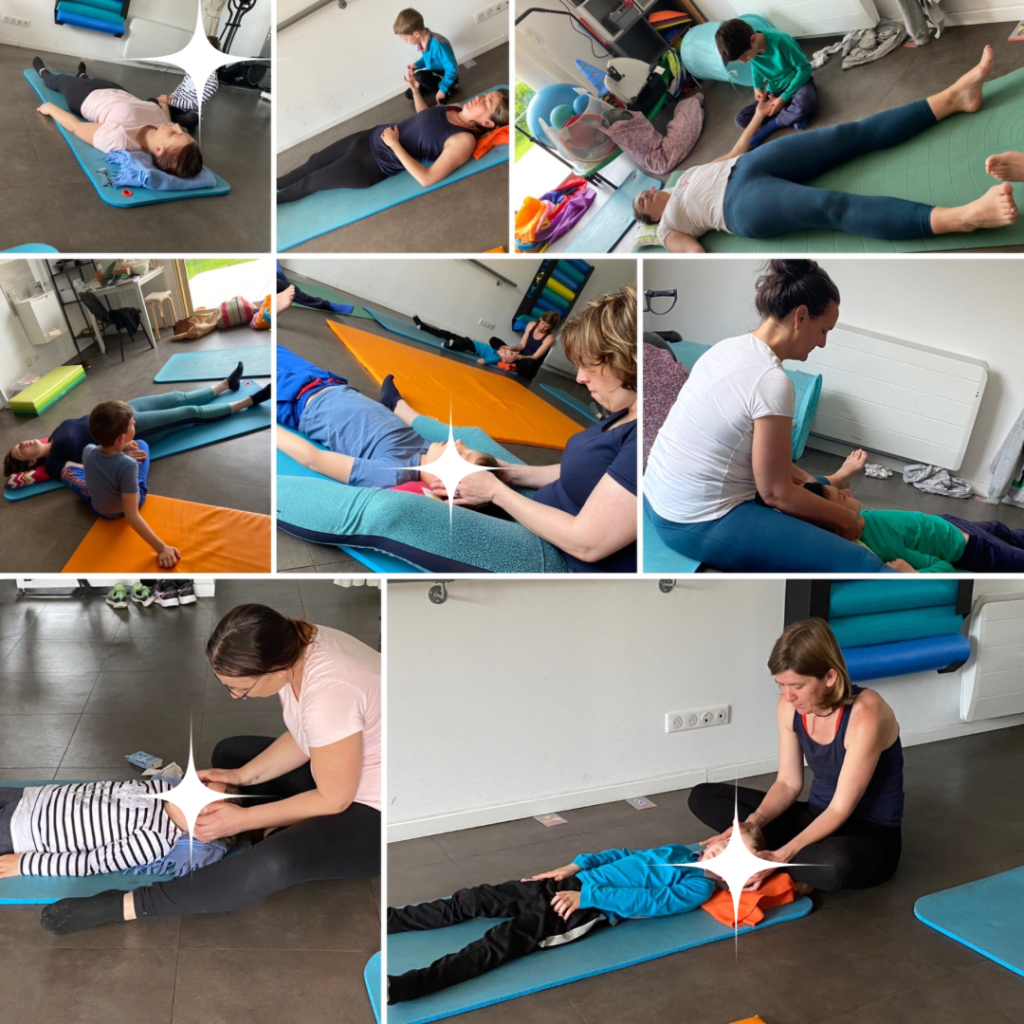La dernière phase est calme, je propose des bercements du corps à l’aide d’une écharpe, il y a aussi un échange chaleureux où l’adulte masse l’enfant puis c’est l’enfant qui s’occupe de sa mère, son père, grand-mère…