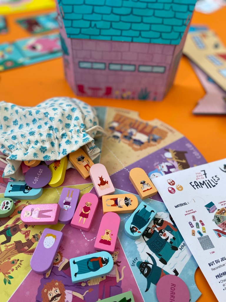 Le Grand jeu de 7 familles des 7 continents avec des jetons en bois et un plateau. À partir de 5 ans